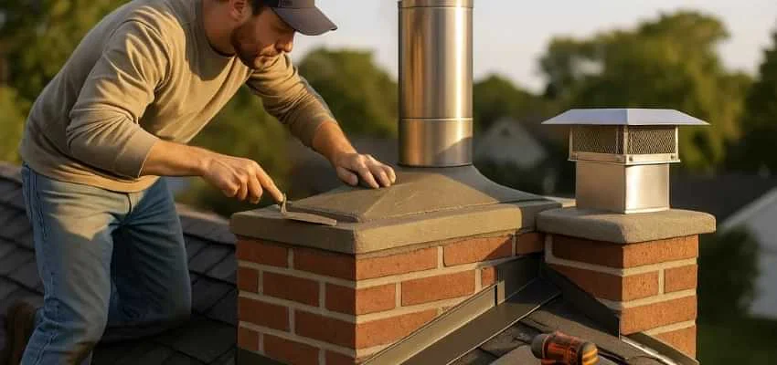 A proper crown protects the top courses. We form a reinforced, sloped crown with a drip edge and an expansion gap around the flue tile, preventing saturation and freeze damage in Stratford Manor, McKinney.